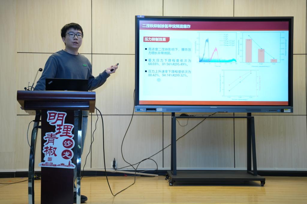 王硕作“二茂铁抑制掺氢甲烷预混爆炸研究”的报告。他通过实验和化学动力学模拟,探究了二茂铁在气体爆炸中的多阶段抑制作用和微观机制。研究显示,二茂铁可显著降低火焰传播速度及爆炸峰值压力,其核心机制在于有效捕获并清除引发链式反应的关键自由基团,从而抑制爆炸向爆轰的转变趋势。