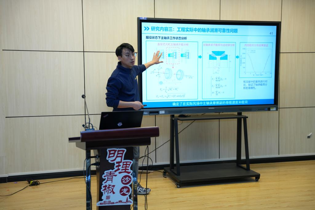 吴淼杰作“润滑可靠性建模理论及应用”的报告。他针对脂润滑理论建模、随机风场效应量化、主轴承润滑可靠性建模、服役状态准确获取与主轴承润滑可靠性评估等关键问题,开展了主轴承的弹流脂润滑建模与可靠性分析方法研究。