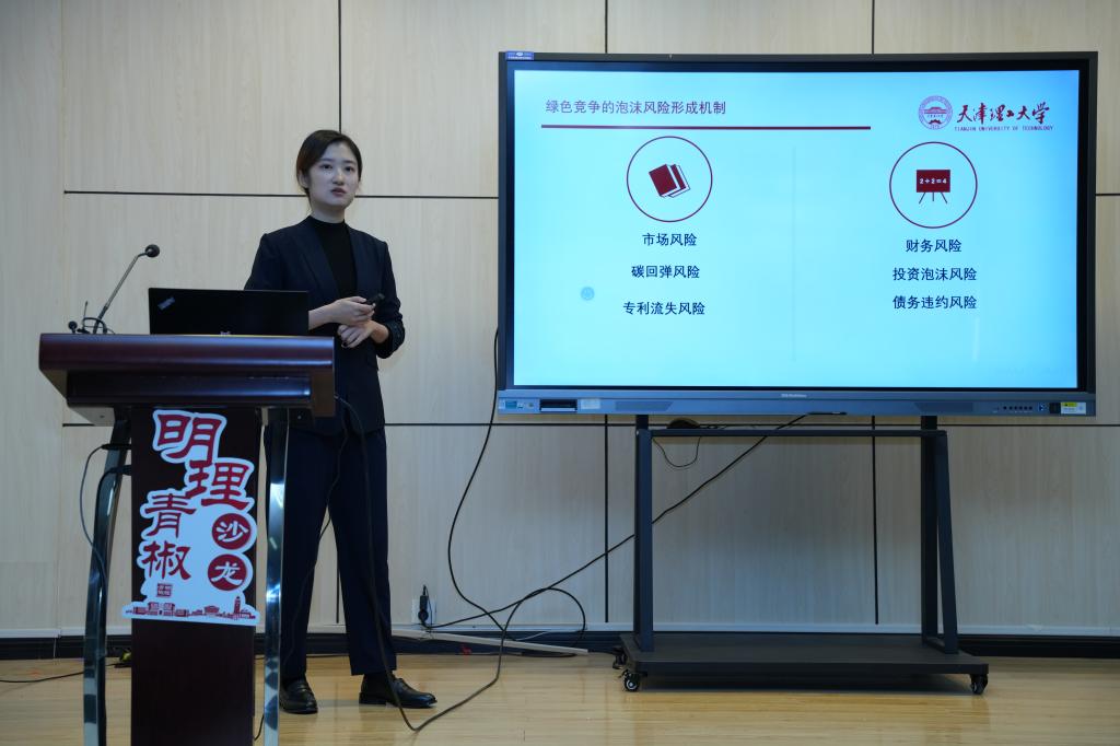 王晓祺作“双碳目标下地方政府绿色创新竞争的泡沫风险识别与防范研究”的报告。她通过实证分析、风险建模与政策仿真等方法,对绿色创新竞争的时空格局演化、企业动机差异、泡沫风险的形成与多层级传导机制进行考察,探究差异化政策工具的治理效能与优化组合设计。