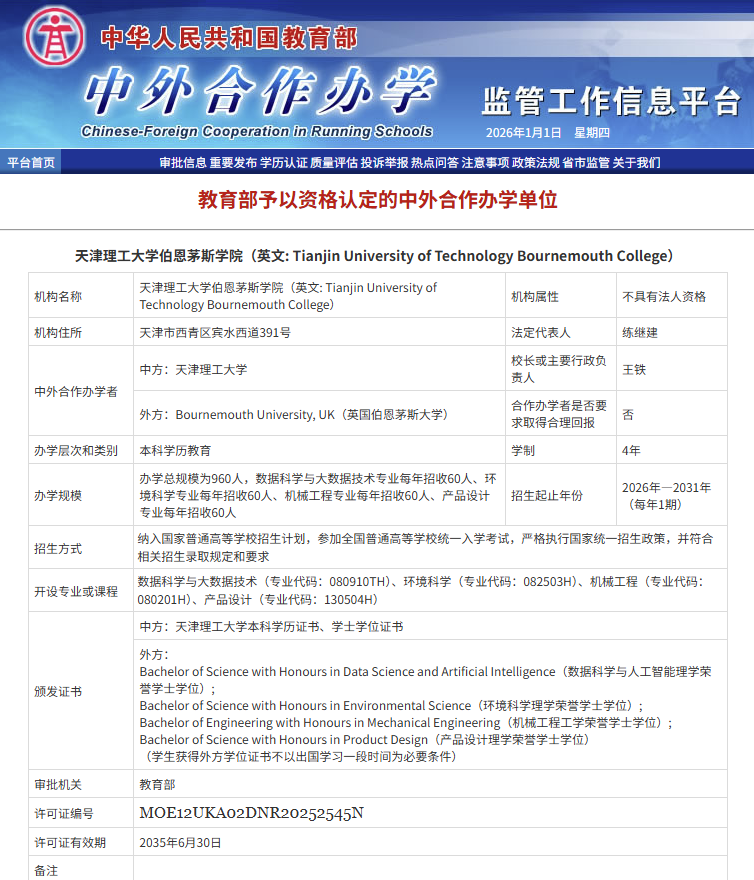 近日,教育部正式批复,我校与英国伯恩茅斯大学合作举办的“天津理工大学伯恩茅斯学院”获批设立(许可证编号:MOE12UKA02DNR20252545N),这是我校首个中外合作办学机构,是学校国际交流与合作的重大突破和国际化办学的标志性成果。