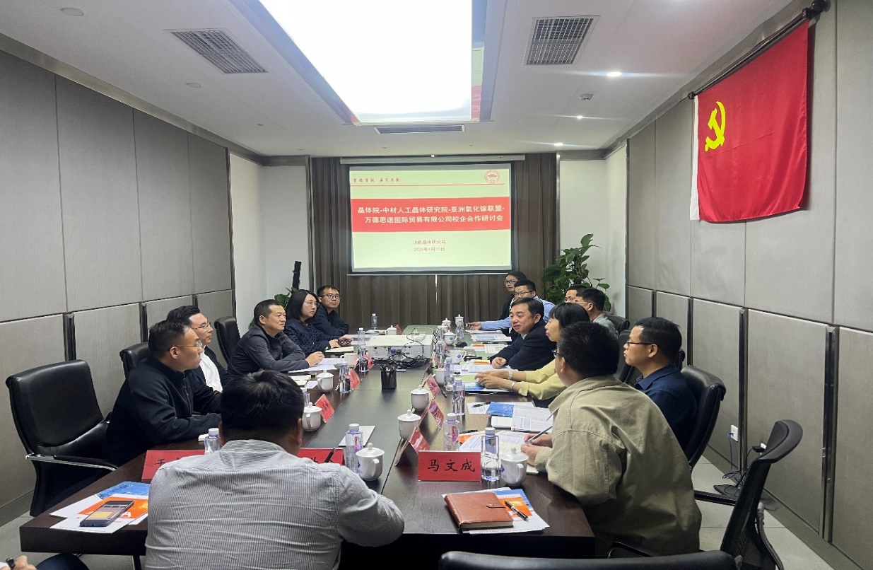 为推动科技创新与产业创新深度融合,促进人工晶体领域协同发展,4月20日,中材人工晶体研究院有限公司副总经理杜洪兵一行到访我校并开展座谈交流。党委常委、副校长叶宁出席会议。亚洲氧化镓联盟、万德思诺国际贸易有限公司相关负责人及研究院教师代表参加座谈。