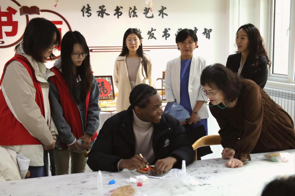 学院师生赴西青区赤龙南街道,开启传统工艺深度体验之旅。留学生走进社区文化工坊,感悟工坊在非遗技艺传承、满足居民文化需求等方面的作用。在手工创作环节,留学生动手感受传统工艺的深厚底蕴与创新活力。留学生们认真地勾勒出“福”字与牡丹花的轮廓,专注学习扎结技法制作芸染发箍,协作调整扭扭棒完成向日葵手作。创作间隙,留学生分享本国民俗文化。
