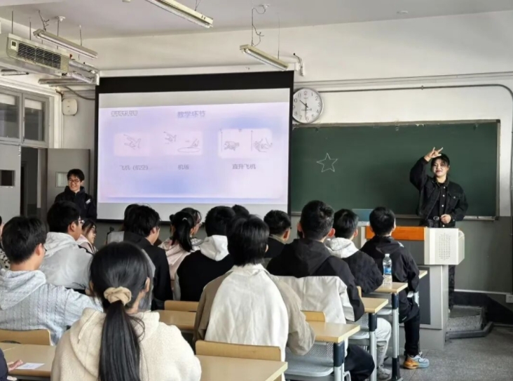 在教学环节,主讲人利用“请出示登机牌”“紧急出口在哪里”“系好安全带”等高频沟通语句,手把手教学生熟练掌握民航专属手语,应对特殊沟通需求。在游戏环节,民航学生们通过眼神交流、肢体默契完成信息传递,既锻炼了沟通协作能力,也让手语“无声却有力”的特点深入人心。随后,参与者们近距离观看了多架飞机,深入机身内部探秘细节。