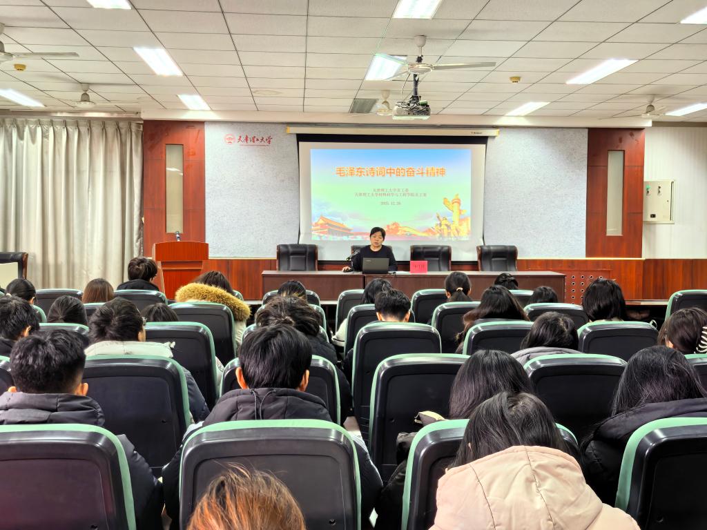 马红健带领同学们深情回顾了毛泽东同志的光辉一生。她按照不同历史时期,深入讲解了《西江月·井冈山》《七律·长征》《沁园春·雪》等经典诗词,阐释其中所蕴含的革命精神。