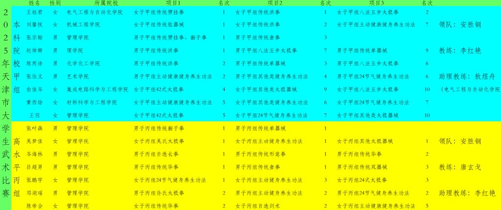 2025年天津市大学生武术比赛在津南区葛沽体育馆举行。学校运动员们在甲组——本科院校组荣获5个第一名、4个第二名、2个第三名;在丙组——高水平组荣获10个第一名、6个第二名、3个第三名。