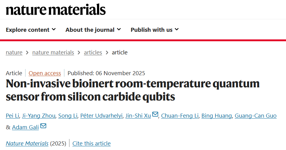 近日,天津理工大学集成电路科学与工程学院(李培、李翠平团队)、中国科学技术大学、北京计算科学研究中心、匈牙利Wigner物理研究中心组建的联合科研团队,在国际顶级期刊《Nature Materials》上发表论文“Non-invasive bioinert room-temperature quantum sensor from silicon carbide qubits”。