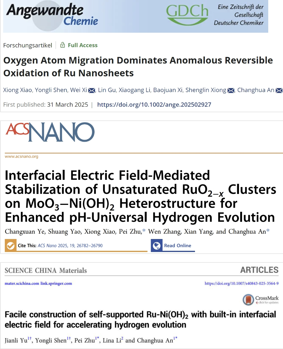 我校化学化工学院安长华教授团队在钌(Ru)基纳米催化剂的可控设计及其在大电流密度电解水制氢研究取得重要突破,其研究成果相继发表于《《Angewandte Chemie International Edition》《ACS Nano》《Science China Materials》等国际高水平期刊。