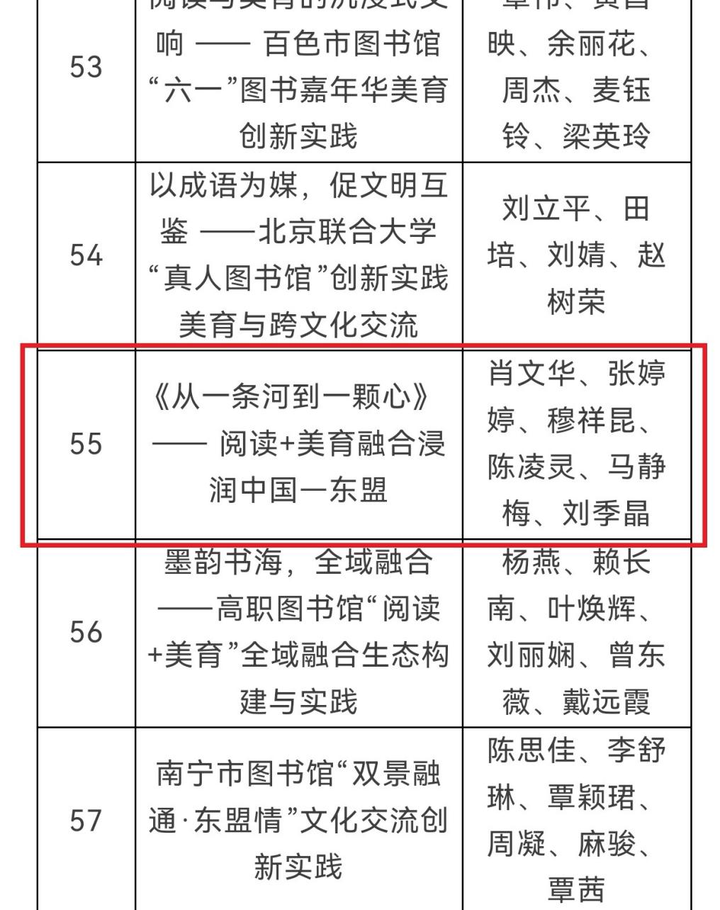 第六届中国—东盟文化创意周高端论坛在广西南宁举办。我校图书馆申报的案例《〈从一条河到一颗心〉——阅读+美育融合浸润中国—东盟》荣获优秀案例。本次论坛以“美育无界・融合共生——同筑中国—东盟文化创意新生态”为主题,共征集到案例368件,经多轮评审,最终评选出73件优秀案例。