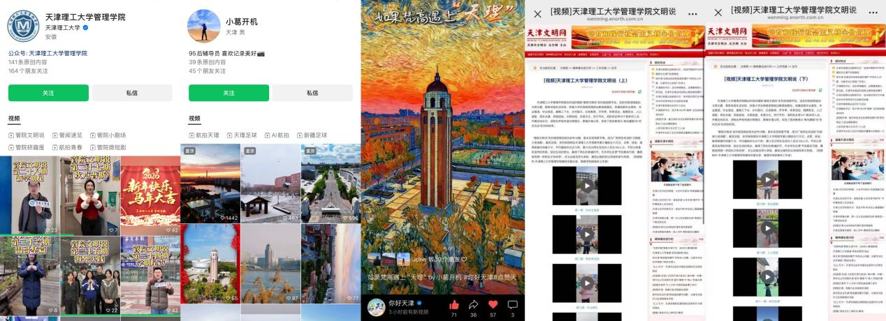 该工作室以“天津理工大学管理学院”“小葛开机”视频号为核心平台,秉持“价值引领、多维赋能、青春共鸣”的运营理念,致力于构建“三维立体化”思政育人新生态。工作室前期积累了扎实的工作基础。截至目前,运营团队在各平台累计发布原创作品178个,其中“天津理工大学管理学院”视频号累计点赞量近1.4万,核心账号“小葛开机”视频号累计点赞量超1.5万。该工作室创作的“航拍天理”“AI航拍”系列短视频,通过无人机与AI技术的融合,生动展现天理之美,播放量达70万次,并被市委宣传部官方账号“你好天津”转载。聚焦校园文明的“管院文明说”系列短视频,已连续更新28期,播放量达18万次,形成了“全员皆可说”的共创氛围,并被市文明办官方账号转载报道。以师生表演形式呈现的“管院小剧场”系列短视频,生动演绎反诈、诚信考试等主题,深受学生喜爱。
