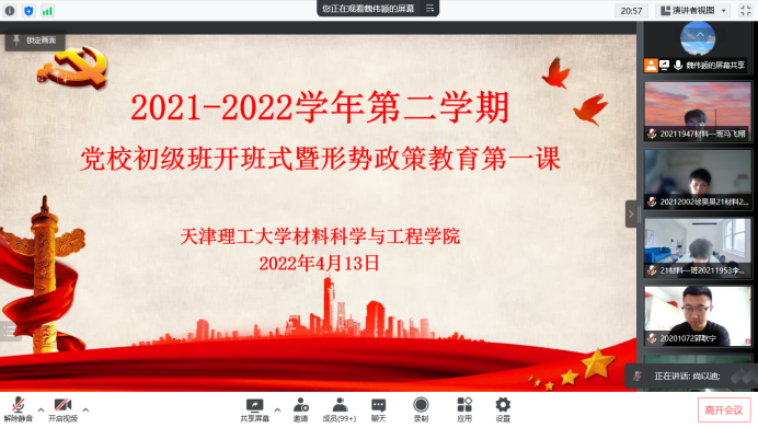 为进一步加强对入党积极分子的教育培养,材料科学与工程学院于近日以线上形式组织开展2021-2022学年第二学期学生党校初级班开班式暨形势政策教育开学第一课,学院党政负责同志、辅导员以及本期初级班120余名学员参加。