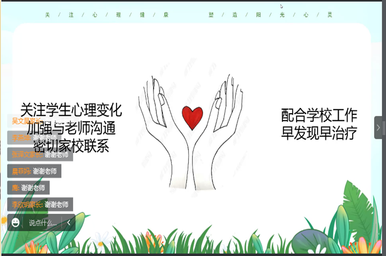 会上,辅导员首先从心理学角度强调了家庭教育对大学生心理健康的重要性,并简单介绍了心理健康知识和学校组织的各类心理健康活动。随后,辅导员围绕自我认知、学习目标和人际关系等方面向家长们介绍了当前大学生心理危机的主要来源,引导家长积极关注学生的心理健康状况,及时帮助学生疏解不良情绪。最后,学院呼吁家长时刻关注学生心理变化,密切家校沟通协作,共同促进学生心理健康。会议结束后,家长们纷纷表示受益匪浅,对本次的线上家长会给予了肯定和好评。