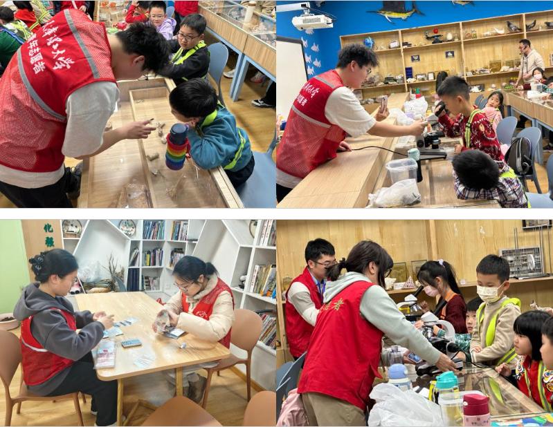 活动当日,志愿者们在科普课堂担任“科学助教”,辅助老师开展各类活动。从化石拼接、生态模拟等趣味实验,再到互动问答,孩子们从被动听讲转变为主动参与,在实践中探索自然奥秘。志愿者们一丝不苟,认真整理科普教具、核对实验材料、布置互动展台,积极营造浓厚的学习氛围。