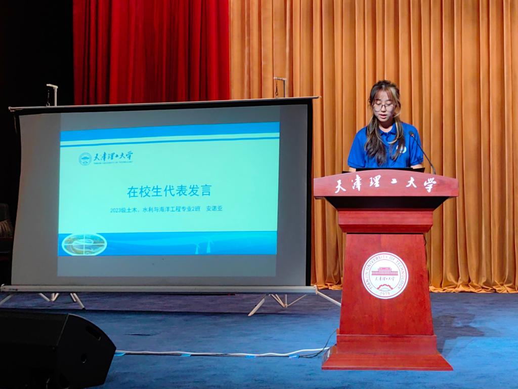 教师代表刘强勉励同学们要珍惜大学时光,保持好奇心与求知欲,并代表全体教师承诺,将恪尽职守,做学生成长路上的良师益友。新生代表吴孜绚表达了对大学生活的无限憧憬,并承诺将不负韶华、不负期望,努力成长为有理想、有本领、有担当的时代新人。在校生代表安诺亚结合自身经历,向学弟学妹们分享了学习方法与成长心得,鼓励他们勇于探索、积极实践,在挑战中实现自我超越。