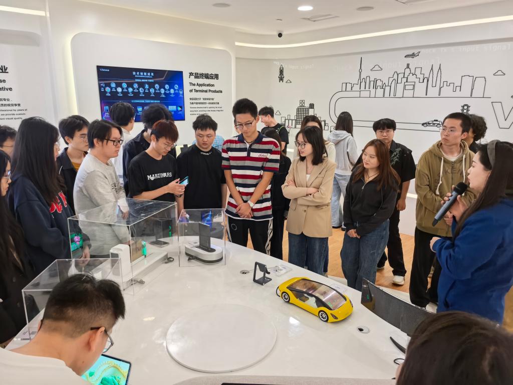 活动伊始,学院师生前往展厅及工艺走廊参观,观看了各代显示屏模组,体验了可弯折手机屏、透明显示屏、不规则显示屏等样品。通过讲解员的生动介绍,大家直观了解维信诺发展历程、核心产品、关键技术及产线运营情况。在此过程中,来访师生对OLED工艺原理、生产技术有了全面的了解。
