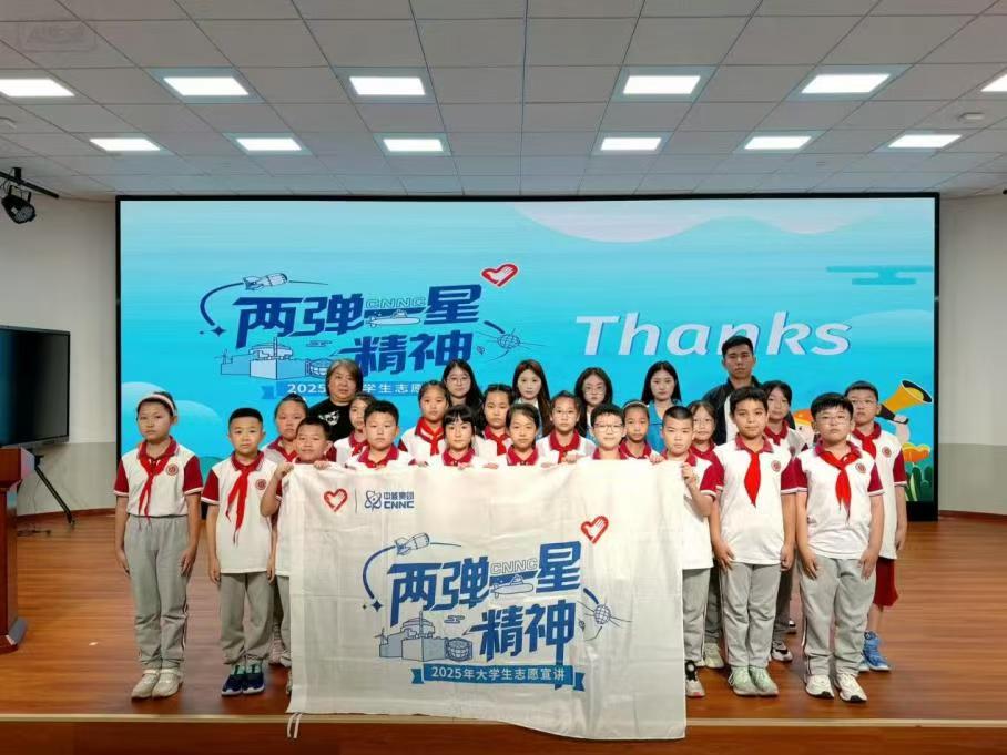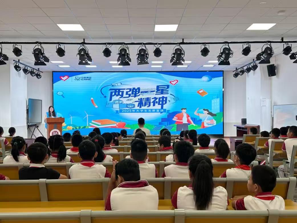 宣讲团成员龚华洋、武梦婷在国旗下演讲,回顾了我国科学家在艰苦条件下研发“两弹一星”的先进事迹。呼吁广大青少年传承“两弹一星”精神,争做新时代追光者。