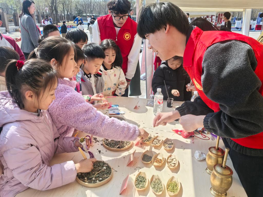 活动中,科普团志愿者通过“消失的颜色”等实验,生动演示氧化还原反应原理,将抽象的化学知识转化为可观可感的奇妙现象,在孩子们心中播下探索科学的种子。在中药香囊制作环节,志愿者引导学生通过观外形、闻气味、触质地来辨识中药材,讲解中医药在防病养生中的智慧,并指导同学们动手配制药材、装填香囊,在实操中感受中医药文化的魅力。